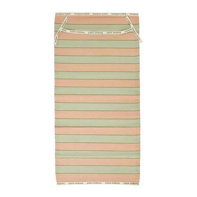 It features a sunset inspired palette of peach and sage stripes, with the words "bonjour soleil" repeating along the trim.