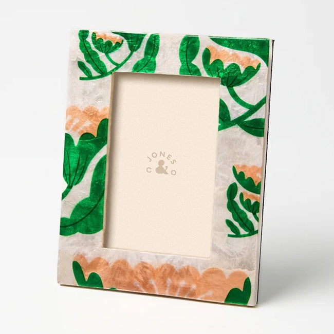 Graphic illustrated flowers span this Capiz shell frame, transforming your photographs into works of art. Hand-crafted by skilled artisans in the Philippines following our Sydney-designed patterns, each piece celebrates the natural luminosity of the shell while adding poppy florals to the design. The Paradis frame brings playful sophistication to shelves and sideboards in the home.