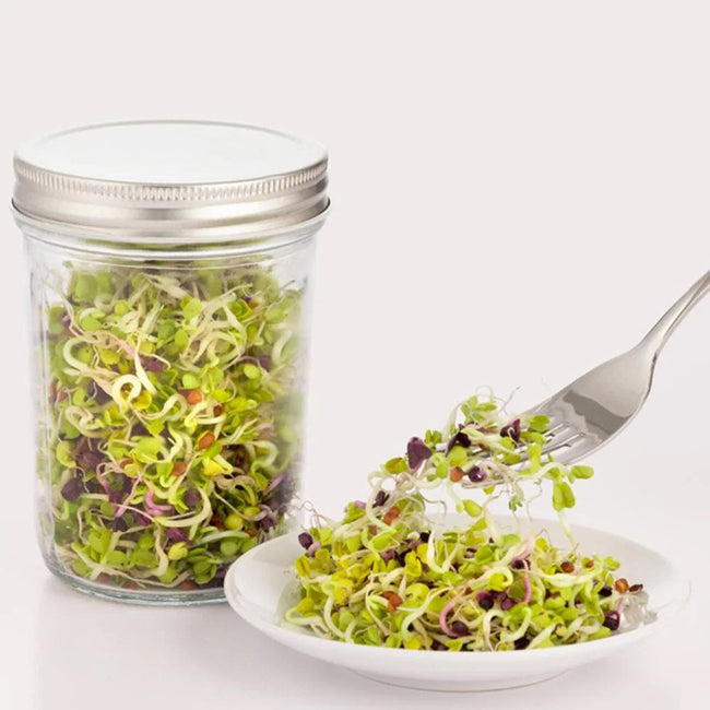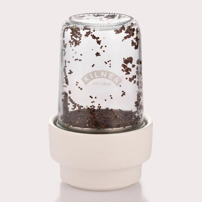 The Kilner® Sprouting Set is designed to make sprouting and storing seeds or pulses as simple as possible. Sprouting is a great way to add extra nutrients, flavor, and texture to your dishes, and this set provides the best conditions for sprouts to develop. It's ideal for a variety of sprouts including broccoli, green beans, radish, lentil, alfalfa, and more. To use, simply soak the seed or grain in the 0.5-liter glass jar for the required time. Drain using the stainless steel insert and then place the jar and insert into the ceramic base, allowing the sprouts to develop as excess water safely drains away into the base. The developed sprouts can then be consumed straight away or stored in the glass jar using the one-piece lid.