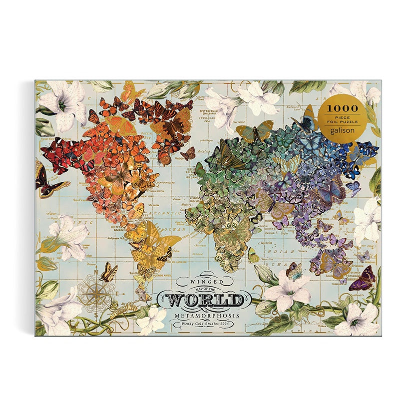 The Winged Metamorphosis 1000 Piece Foil Puzzle from Galison, features colorful and whimsical map art by collage artist Wendy Gold of the world covered with butterflies and highlighted with gold metallic foil touches.