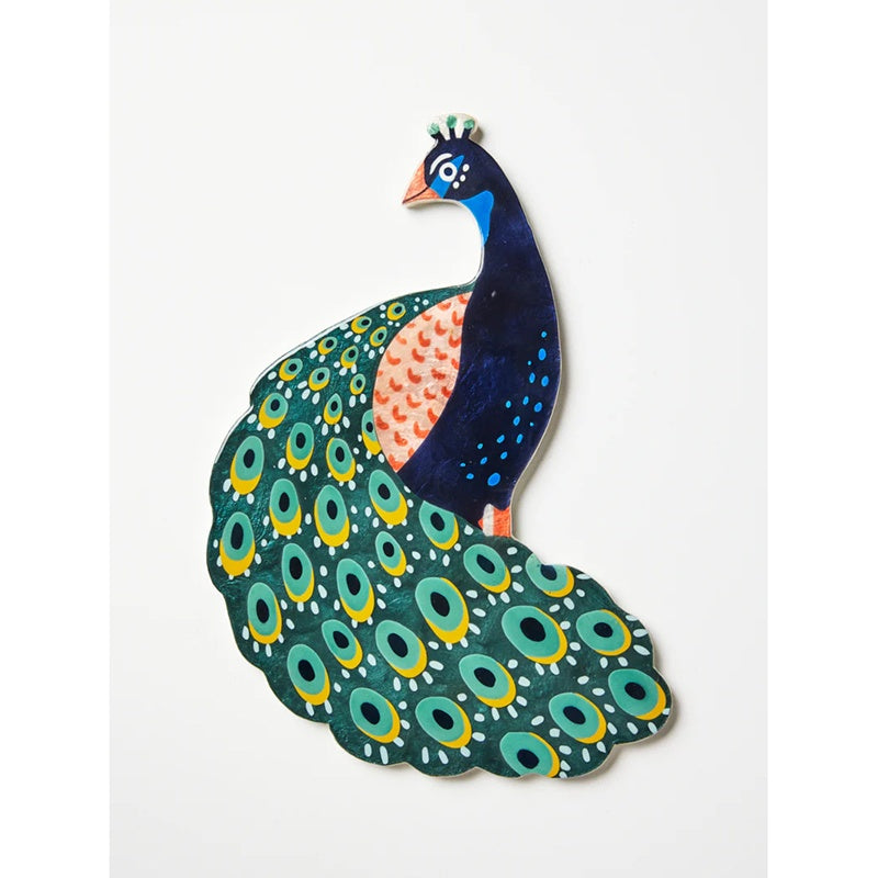 Proud as a peacock and twice as charming. This handmade peacock wall art is crafted from lustrous capiz shell, then painted by hand in rich jewel tones and bold patterning. It's tropical bird decor with a personality as colourful as its tail feathers. Team with other winged art in the Canopy range for ultimate tropical joy!