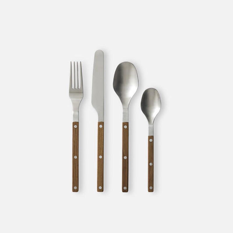 Made from premium 18/10 stainless steel with a brushed finish. Each piece is thoughtfully weighted for a satisfying, balanced feel, bringing a sense of understated elegance to every meal. The set includes 16 pieces: four forks, four knives, four spoons, and four teaspoons.