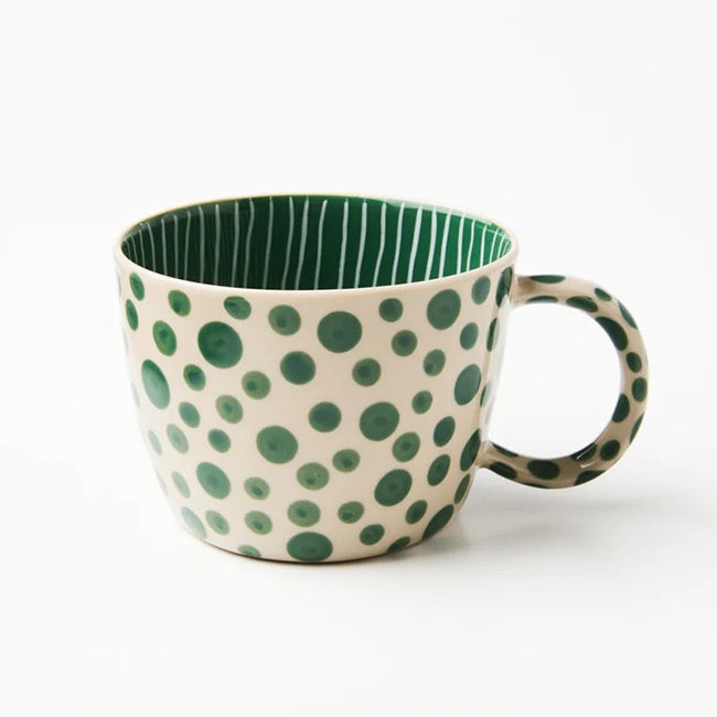 Bold green spots command attention on this perfectly proportioned Chino mug, each organic dot applied by hand with deliberate care. Designed in our Sydney studio and crafted by Vietnamese artisans from durable earthenware, its organic form makes it perfect for lazy Sunday coffees or comforting evening tea a tactile companion to daily rituals..