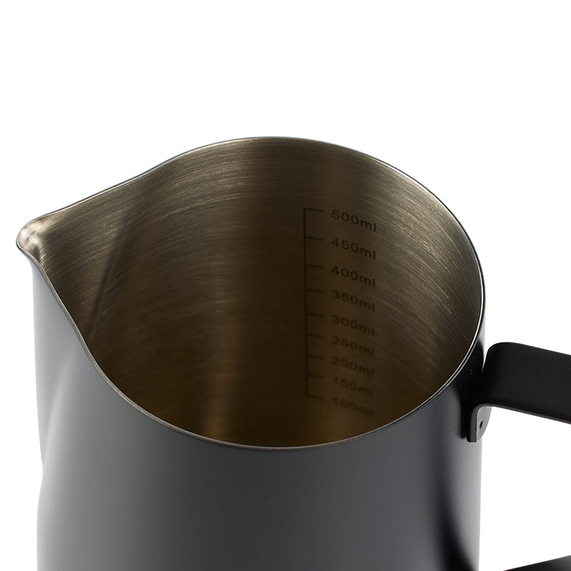 This black powder-coated stainless steel jug is a stylish addition to your home barista setup.