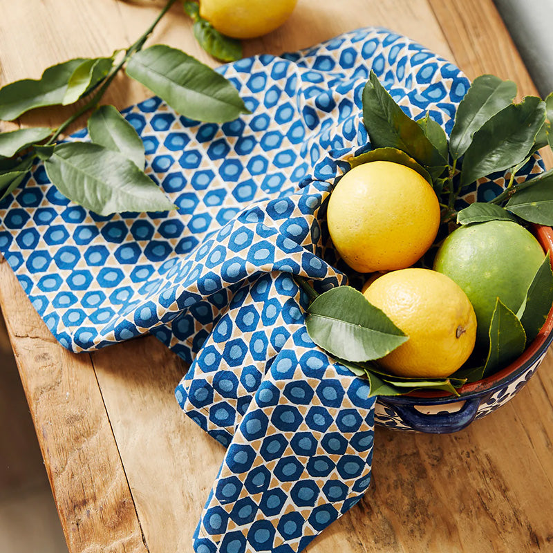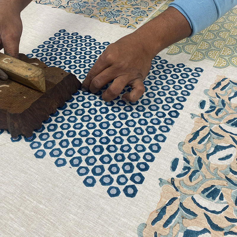 Much like the mosaic walls which inspired this design, Bejmat has a luminous quality. Bejmat has been hand block printed by skilled artisans.